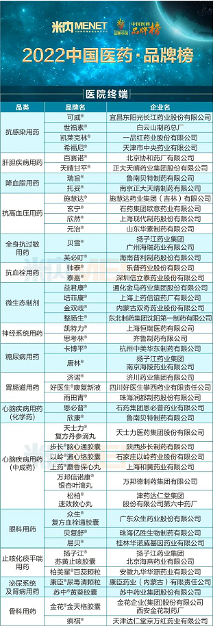 2022年7月14日,2022中国医药•品牌榜于湖州“稳健•迈向未来”交流会上重磅发布。在众多药企的踊跃参与及广大网友的热烈支持下,经过全国品牌征集、候选名单公示、投票评选等环节后,最终产生医院终端44个品牌(涉及16个品类),零售终端63个品牌(涉及23个品类,含中药饮片(精制)、保健品、家用医疗器械),基层终端21个品牌(涉及7个品类),合计128个品牌荣登2022中国医药•品牌榜。