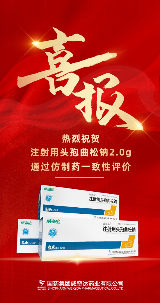 4月15日,国药威奇达收到国家药品监督管理局核准签发的《药品补充申请批准通知书》,批准注射用头孢曲松钠(2.0g)通过仿制药质量和疗效一致性评价。