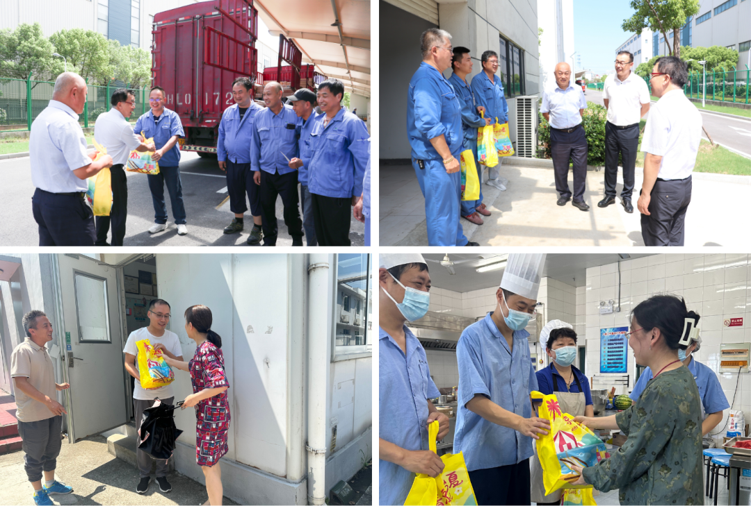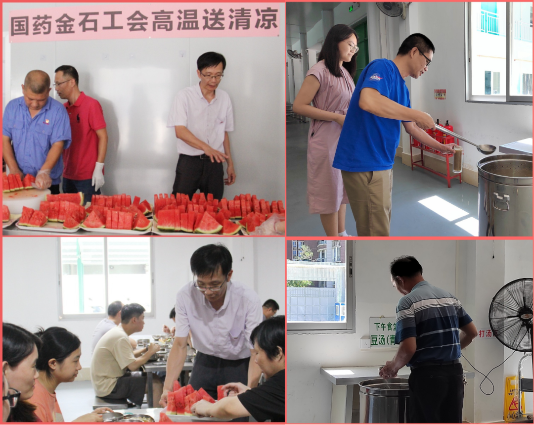 在汕头,国药金石工会主席黄扬彬带队为门卫班、食堂班、电仪综合班等班组员工送出清凉降火凉茶,一句句“辛苦了”温馨有力。为解暑降温,公司工会还为全体员工送上西瓜,食堂班为每一位员工精心准备了冬瓜绿豆饮、红豆薏米汤、八宝粥等解暑甜汤,为员工们驱散了酷热与疲惫,带来清凉与舒适。