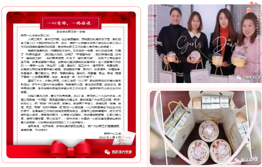 国药一心工会开展了“喜迎二十大•巾帼心向党”三八妇女节系列活动,为全体女职工送上暖心的问候信、精美的礼物、定制的蛋糕,表达着对女职工的关爱和美好的祝愿,通过公众号、微信群、宣传栏等平台开展《妇女权益保障法》、防疫防控知识等宣传及网络答题活动,营造关心关注女职工权益的良好氛围。